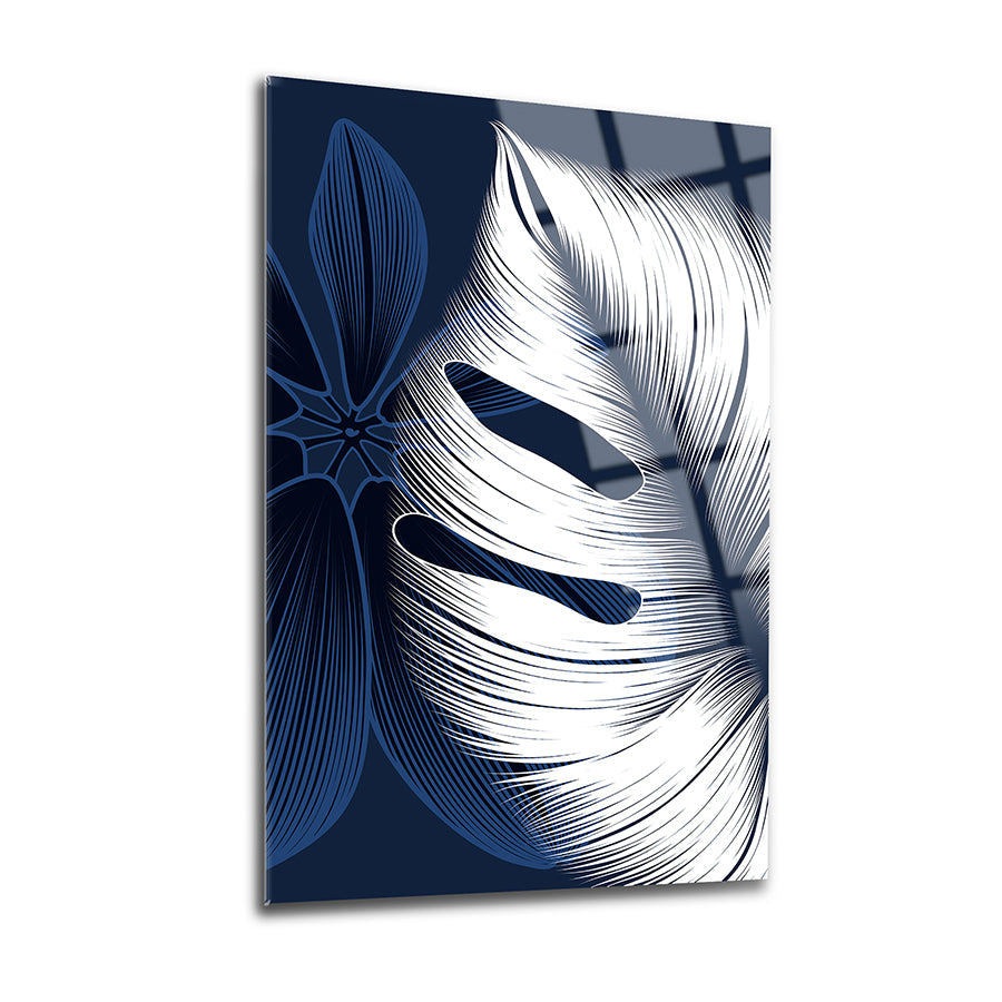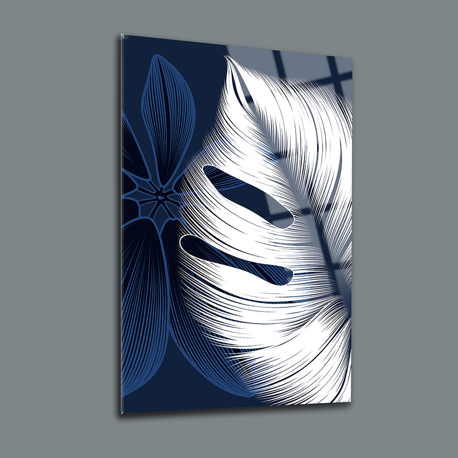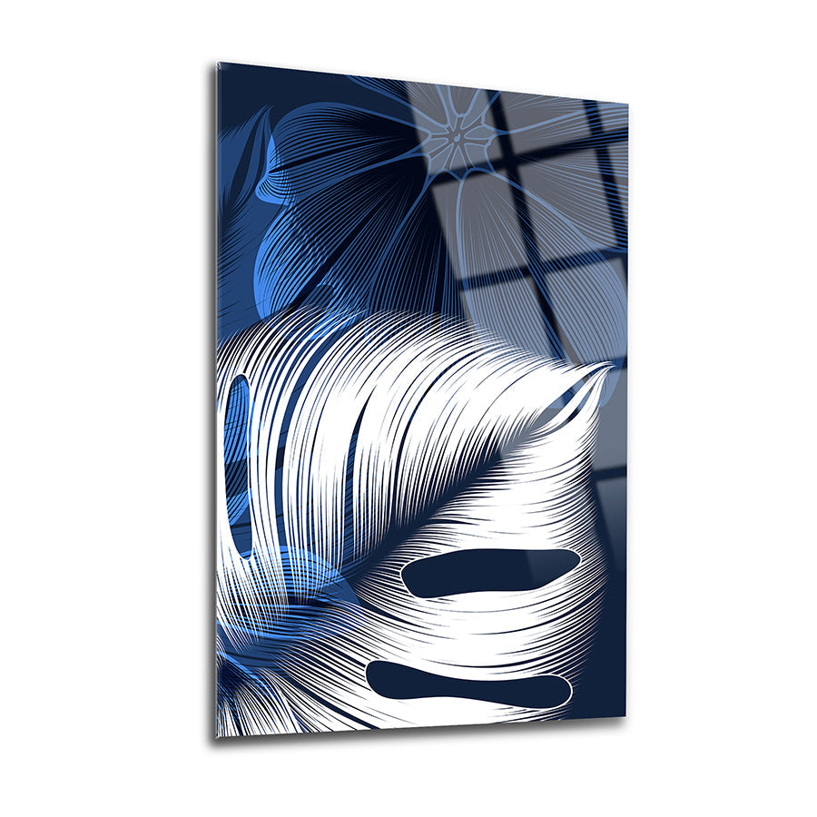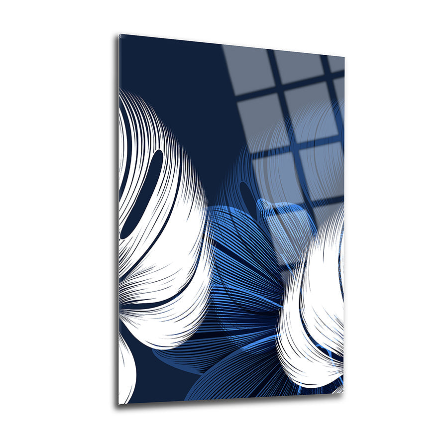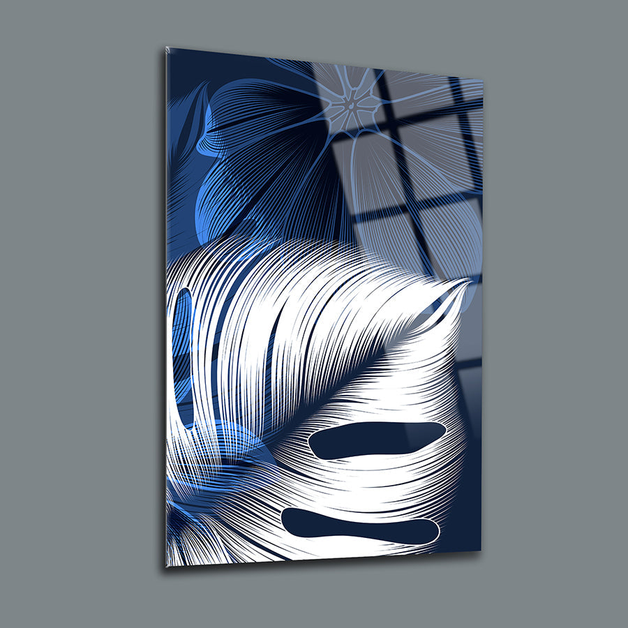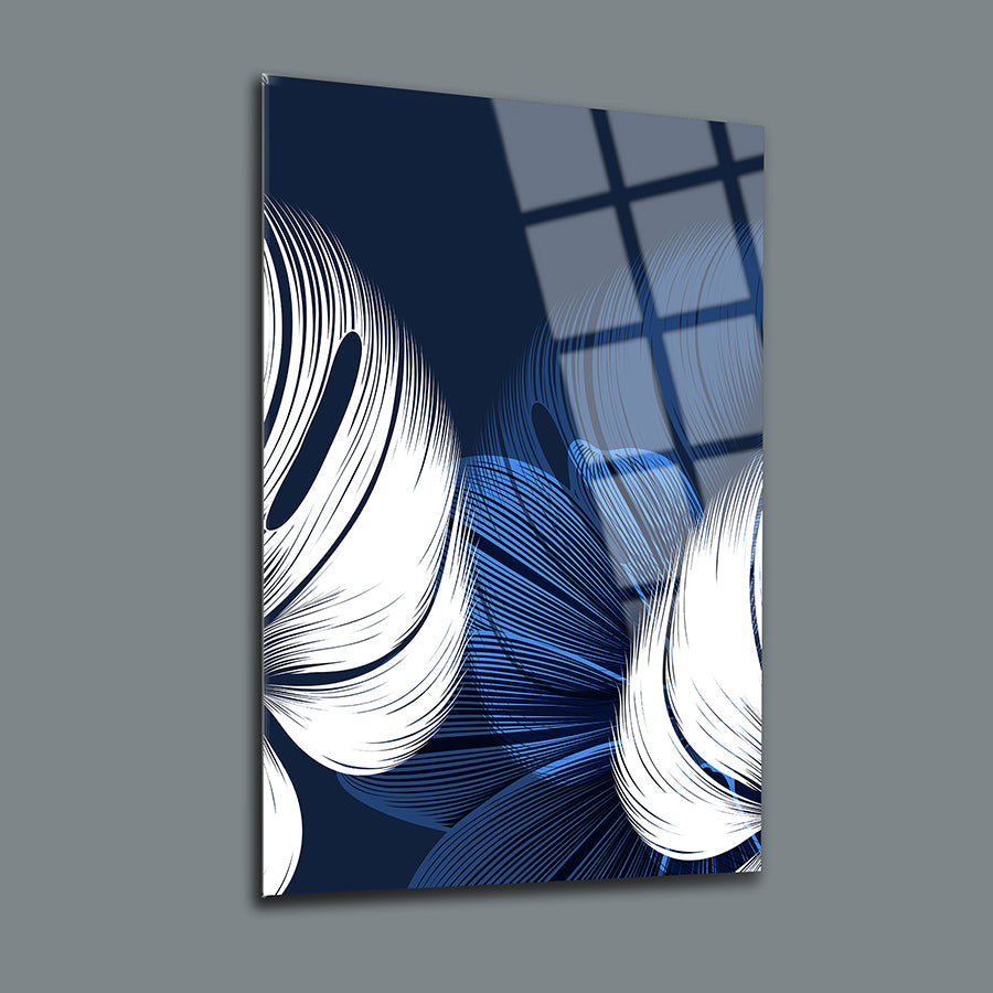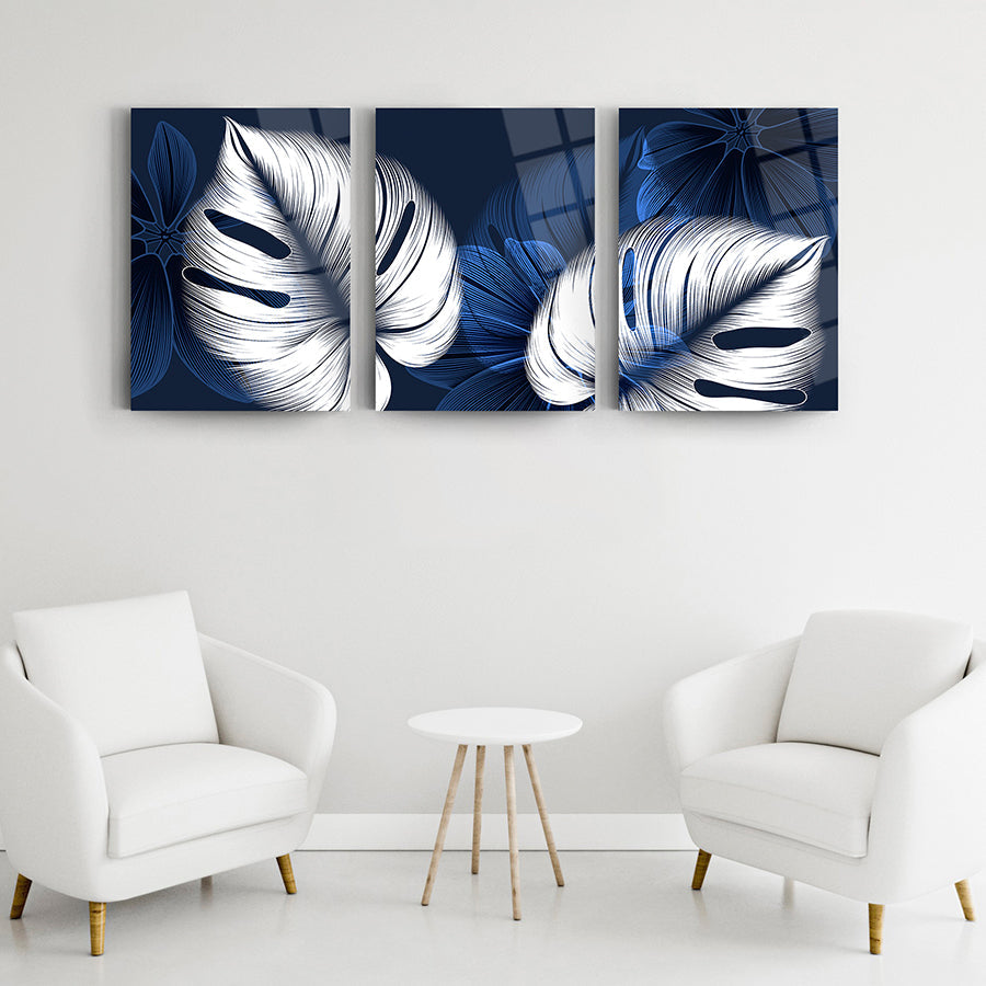 Mavi Beyaz Yapraklar 3'lü Set Cam Tablo